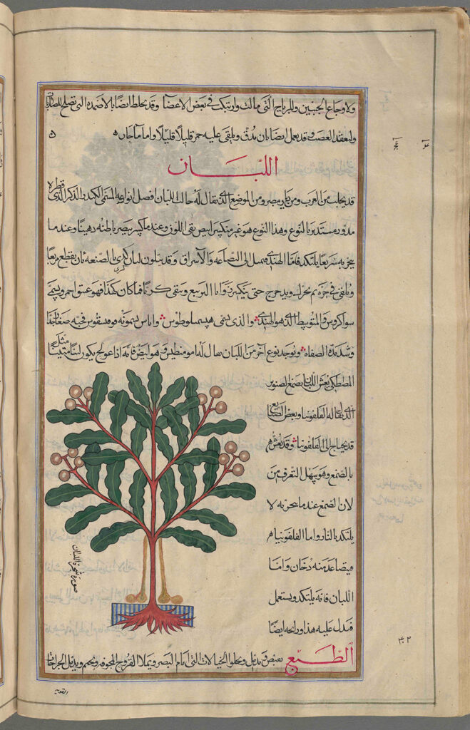 Boswellia sacra also features in a number of Arabic translations of the original Greek text, such as in the Kitāb al-Ḥašāʾiš fī hāyūlā al-ʿilāg ̌al-ṭibbī (ms. Or. 289, fol. 16v) illustrated by an artist from Samarkand around 1083. Interestingly, the artist did not depict the resin but focused on the tree’s other characteristics: knots on the trunk, the crenate-serrate shape of the leaflets margin, and the fruit, depicted as yellowish-brown spheres clustered at the end of the branches. Despite the highly stylized technique, particularly in terms of the general shape of the tree, these striking features denote either first-hand knowledge of the plant or, at the very least access, to relatively accurate sources describing its real appearance. The same features were used by scribes working on several other Arab manuscripts of De materia medica, who occasionally added a yellow liquid flowing down each side of the trunk as well as a woven mat placed at the foot of the tree (BnF, Arab ms. 4947; McGill, ms. 7508; NYPL, Persian ms. 39). This approach to representing the tree can also be found in a Seljuk16The Seljuk Empire, or Great Seljuk Empire, was a medieval, culturally Sunni Muslim empire stretching from Anatolia and the Levant in the west to Hindu Kush in the east, and from Central Asia in the north to the Persian Gulf in the south. It peaked in the late 11th century. version of another ancient pharmacological work, The Book of Theriac, dating from 1199 and preserved under the title Kitāb al-diryāq (BnF, Arabic ms. 2964), pointing to the existence of a specifically Islamic iconographical tradition concerning the frankincense tree in medical literature.17None of the illustrations in Western manuscripts feature these characteristics. Western artists, unfamiliar with details of the tree’s appearance, tended to characterize it by depicting resin in the form of tears. The rest of their representations bear no resemblance to reality. By a process of comparison we can therefore assume that at least some of the illuminations found in Arabic manuscripts were based on depictions of the tree taken from nature by artists from the southern Arabian Peninsula. However, there is still a need for an exhaustive study of these representations in medieval Arabic medical literature.