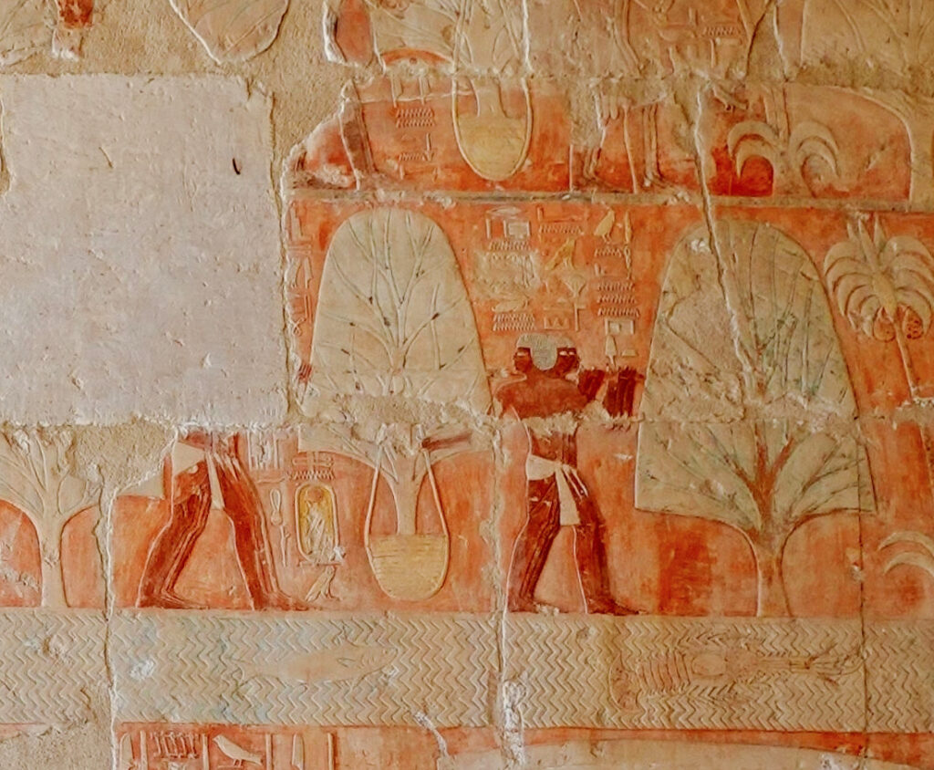 The trees depicted on the Punt reliefs at the Deir el-Bahari mortuary temple in Egypt were long identified as Boswellia. The reliefs commemorate the expedition organized around 1473–1458 BCE by Queen Hatshepsut to the faraway Land of Punt (Pwn.t), home of olibanum, myrrh and other goods highly prized in her kingdom. While the exact location of the ancient land of frankincense is still debated, most experts situate it in the northern part of the Horn of Africa2Kathryn A. Bard and Rodolfo Fattovich, Seafaring Expeditions to Punt in the Middle Kingdom, Leiden, Brill, 2018, pp. 156–175. https://doi.org/10.1163/9789004379602_008 or the west coast of modern-day Yemen3Frédéric Servajean, “Aromates et parfums d’Egypte” [Aromatic Substances and Perfumes of Egypt], in Senteurs célestes, arômes du passé. Parfums & aromates dans l’Antiquité méditerranéenne [Divine odors, aromas of the past. Perfumes & aromatic substances in Mediterranean antiquity] (Lattara archaeological site – Musée Henri Prades, June 20, 2024 – February 3, 2025), Frédéric Servajean and Diane Dusseaux (eds.), Gent, Snoeck, 2024, p. 22.. We know that the Egyptians returned from the trip laden with riches, including aromatic resins and living specimens of resin-producing trees to be transplanted in the Karnak temple to honor the god Amon4Although we know a great deal about the voyage arranged by Hatshepsut thanks to the wealth of iconographic and epigraphic documentation on the southern gate of Deir el-Bahari, it is just one of the fifteen or so expeditions to Punt organized during just over a thousand years of Egyptian history. (Frédéric Servajean, “Le pays de Pount et la quête des aromates” [The Land of Punt and the quest for aromatic substances] in Parfums d’Égypte. Du pays de Pount aux rives du Nil [Perfumes of Egypt. From the Land of Punt to the Banks of the Nile], (the Egyptian Museum in Cairo, December 1, 2024 – February 28, 2025), Hanane Gaber and Frédéric Servajean (eds.), Gent, Snoeck, 2024, pp. 164–167.).