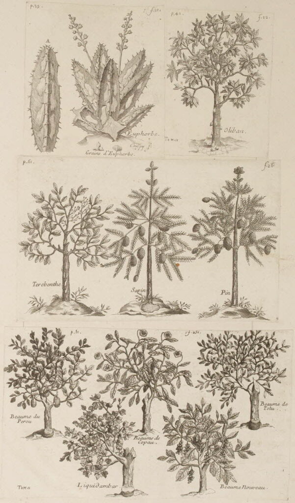 The scarcity of Western representations of Boswellia sacra is also due to a long-held uncertainty over the far-off tree’s appearance. Images are not taken from nature but from earlier copies or written accounts, themselves approximative. Descriptions of the tree provided by authors of antiquity such as Herodotus, Theophrastus, Diodorus of Sicily, Ptolemy, Dioscorides and Ovid are often contradictory, when not steeped in mythology. As early as the first century CE, Pliny the Elder noted that no one could agree either on the tree’s shape or its size, and that no Greek or Latin text had been able to offer an accurate description. In 1688, in his Histoire de Louis le Grand, Jean Donneau de Visé noted: “The shape of the tree is contentious to such an extent that it has not yet been completely determined.”27Jean Donneau de Visé, Histoire de Louis le Grand contenue dans les rapports qui se trouvent entre ses actions et les qualités et vertus des Fleurs et des Plantes [History of Louis the Great encompassed by the relationship between his actions and the qualities and virtues of Flowers and Plants], Paris, 1688, fol. 18. (French ms. 6995, held at the BnF). In this peculiar book, the author gives voice to various plants in praise of Louis XIV by drawing parallels between the king’s virtues and those of the plants. The first is the myrrh tree, the second the frankincense tree, which addresses the monarch in these terms: “My shape is very much contested; King Antigonus used to say that I looked like the Terebinth, and King Juba that I was related to the Maple on the Euxin Bridge. Many are of the opinion that my leaf resembles the Bay Tree, which is the most commonly held belief. The fashion in which you are made is in no way disputed, and all people agree that if a healthy complexion and majestic and affable aspect would serve to choose Kings, and if your birth had not given you a crown, you would wear the crown for the entire world, were there but one sovereign.” However, this did not deter painter and miniaturist Jean Joubert from accompanying the text with a color picture of the tree, aligning with one of Pliny’s descriptions by giving it foliage similar to the bay tree and adding six smoking censers.